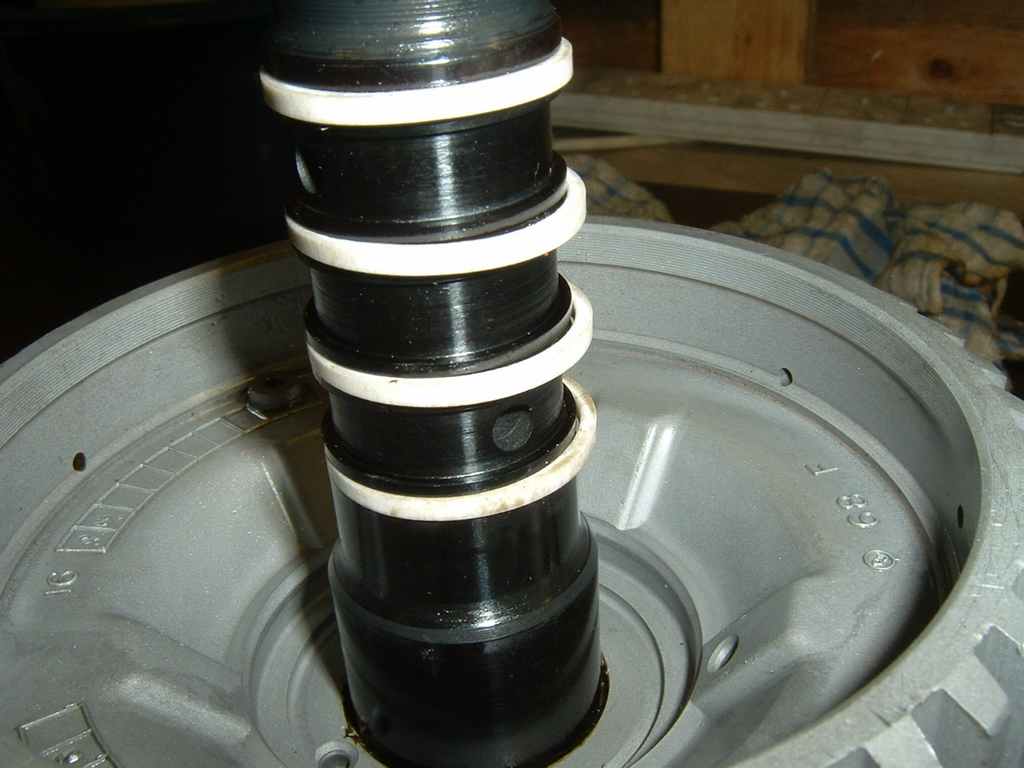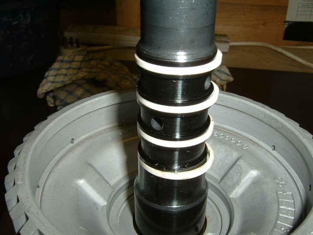 The overrun piston can be simply guided into place, because the TDE modified one uses an O ring instead of a lip seal. (otherwise you could use the mylar sheet trick again)