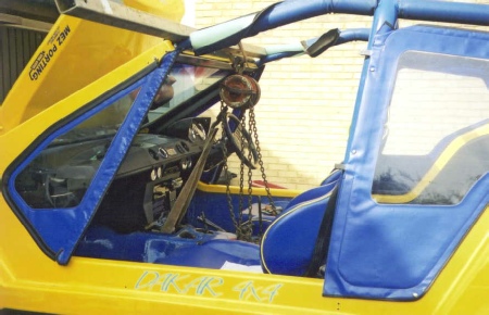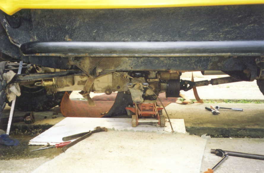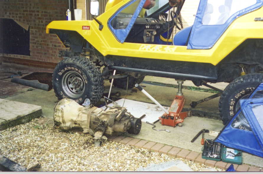 I had a cunning idea; i put a beam across the roll cage, and used a block and tackle to lower the gearbox down. Notice how much tension is on the ratchet strap.