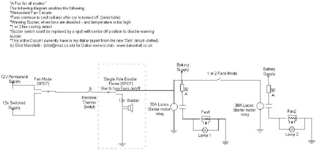 Here is the Circuit diagram for my fans. It now features a buzzer that will sound if you turn your fans off when in water,