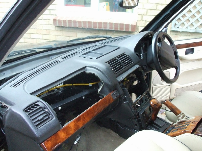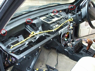 There are four bolts holding the dash in. Two each side. Use a 8mm ratchet spanner to undo them. (photo with dashboard removed shows them in red). Then on each side there is a series of screws attaching the lower part of the dashboard to the chassis (black screws)