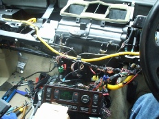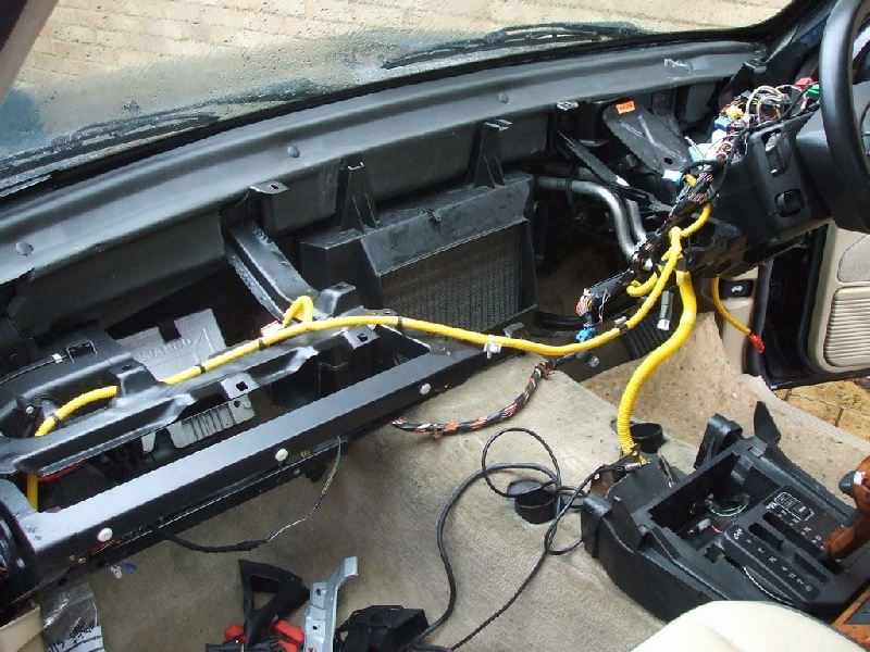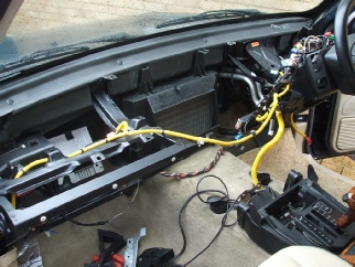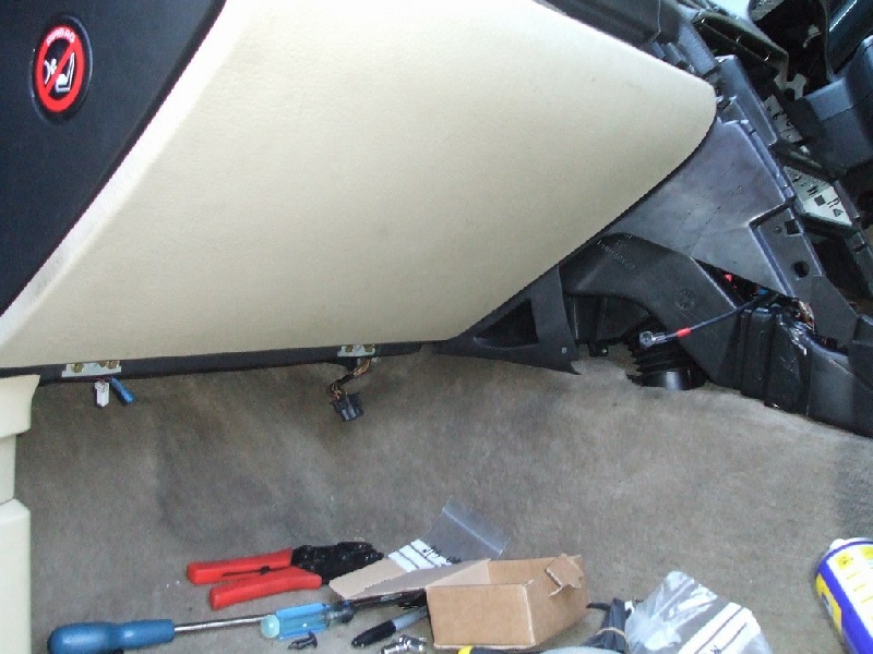 You need to get the front support bar back between the dashboard. Because you have loosened the supports for the dash there is a fair amount of wiggle room. You can see my knee hard up against the hvac and forcing the bar back in between the black dash supports.