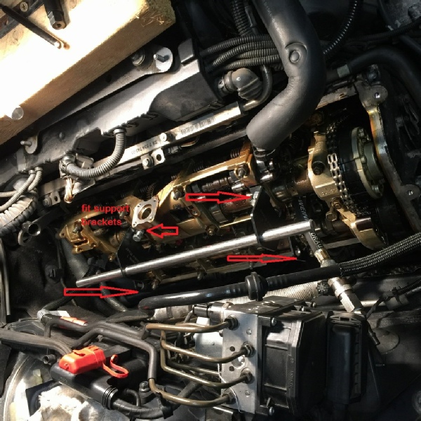 Remove the oil spray bar and Fit the AGA brackets to the cam -