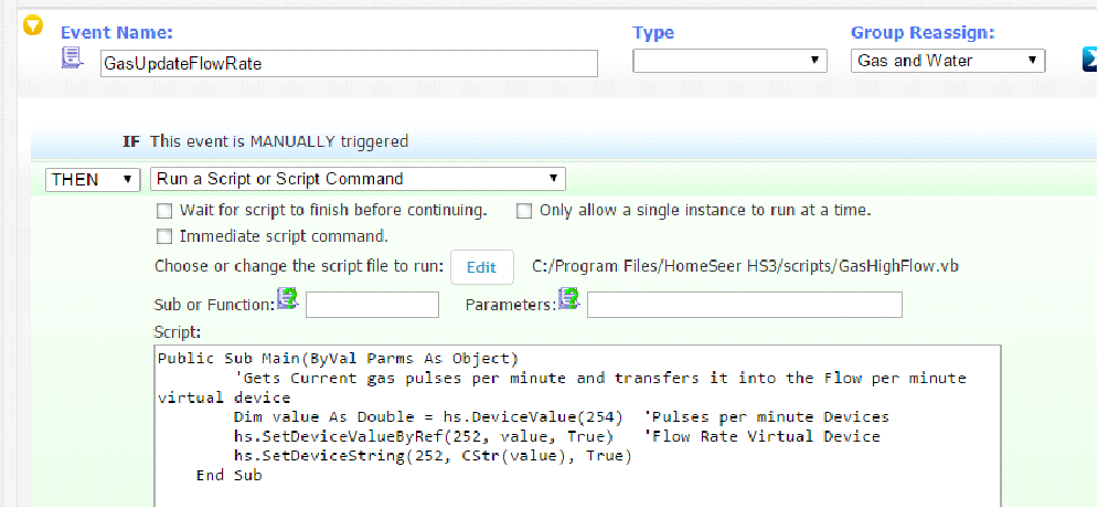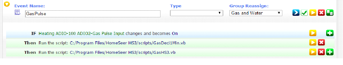 In Homeseer3 I have the following virtual devices created, which are used to count the gas pulses and store the charges in the text fields.