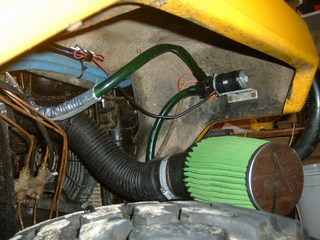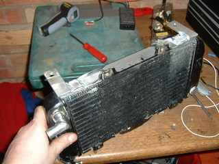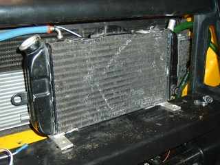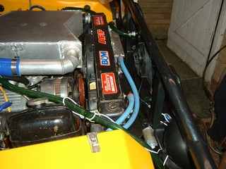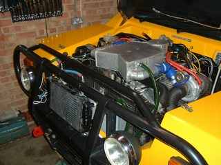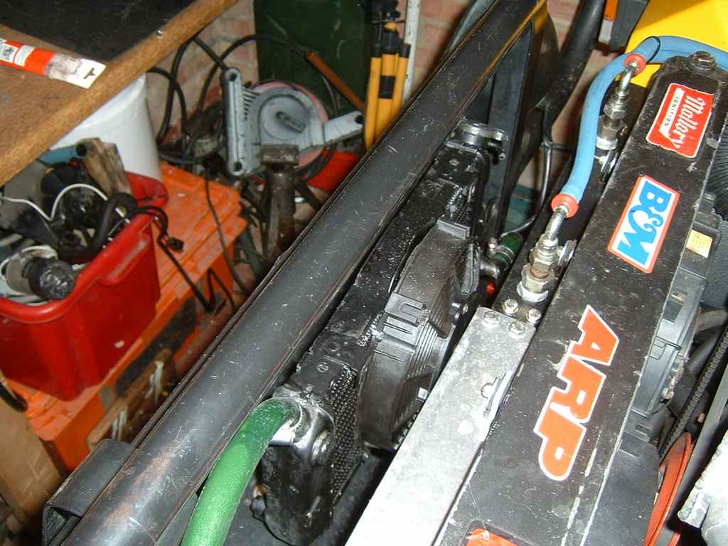 Things made a bit more permanent, with the coolant pump placed in the inner wheel arch and the water inlets moved around on the rad. And brackets added.