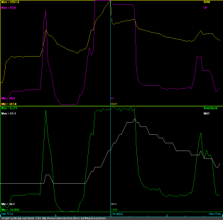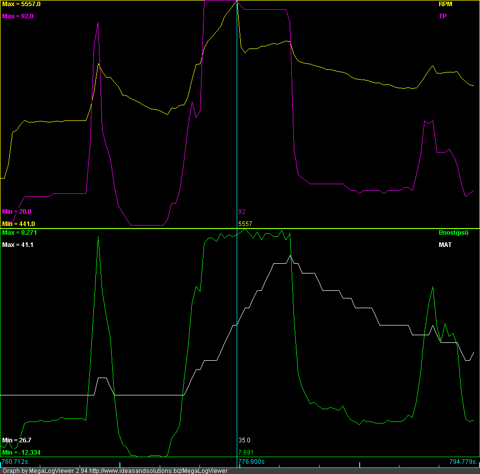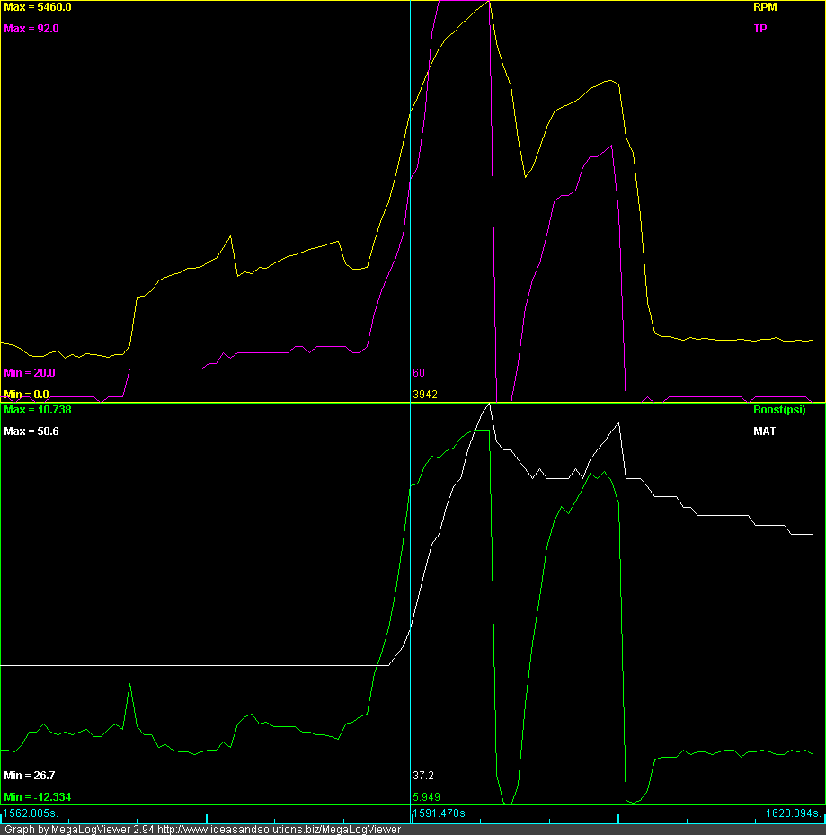 Purple is throttle position, not 100% till about 4800 RPM. Green is boost: