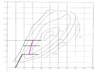 Here's the compressor map plot, for 8,12 & 14psi respectively. The purple line represents